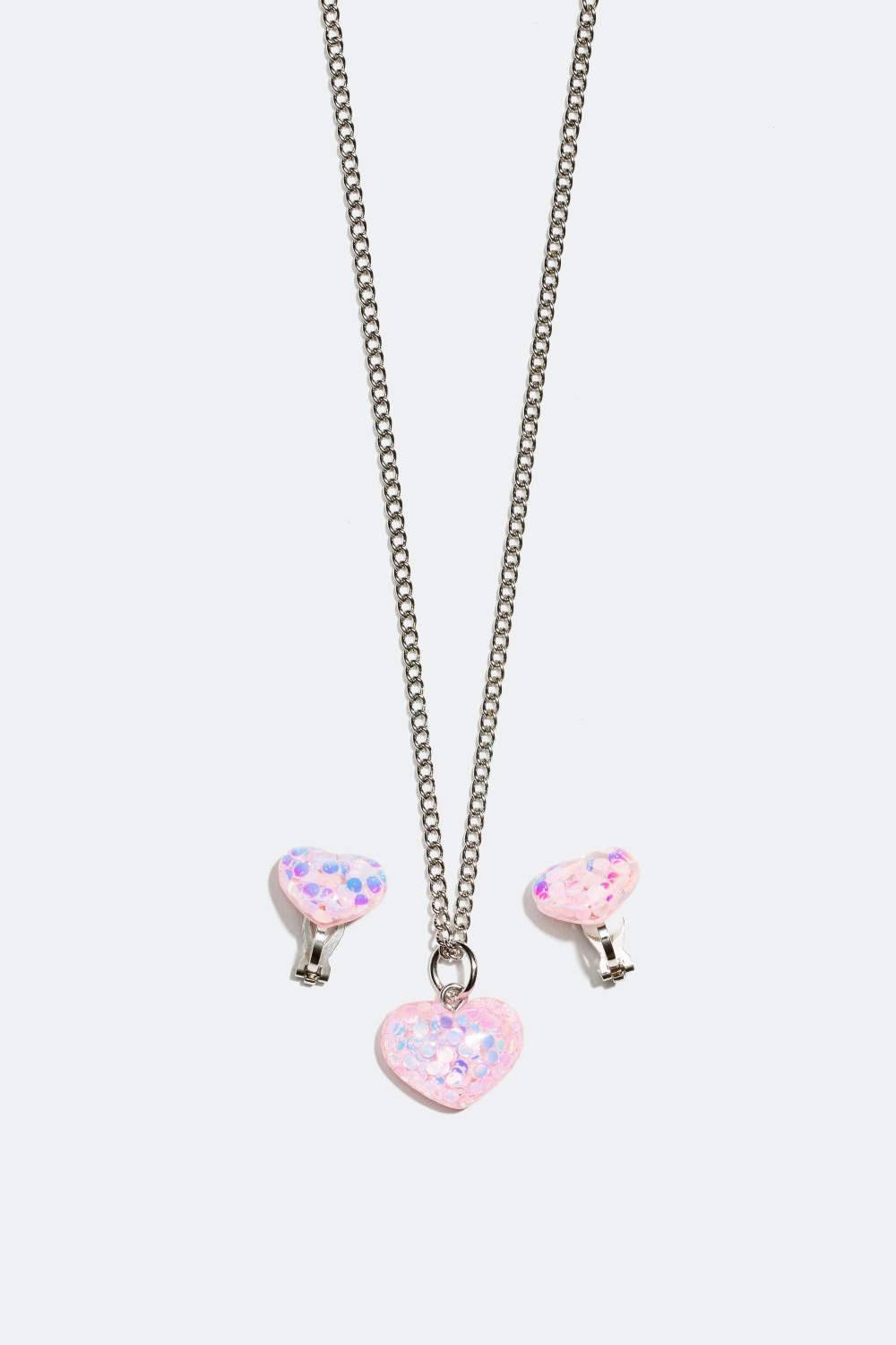 Sølvfarget halskjede og øreklips som kommer i to utførelser. Ett sett med hjerter i plast med rosa paljetter inni. Ett sett med sommerfugler i plast med lilla paljetter inni.