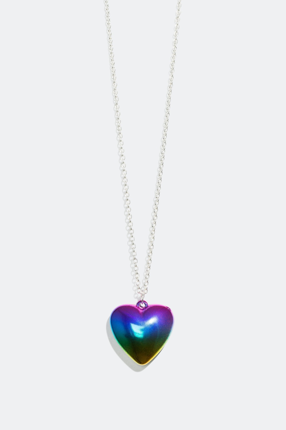 Halskjede, stort hjerte - Halskjede av tynt metallkjede med anheng i form av et stort hjerte i regnbuens farger. Regulerbar lengde.