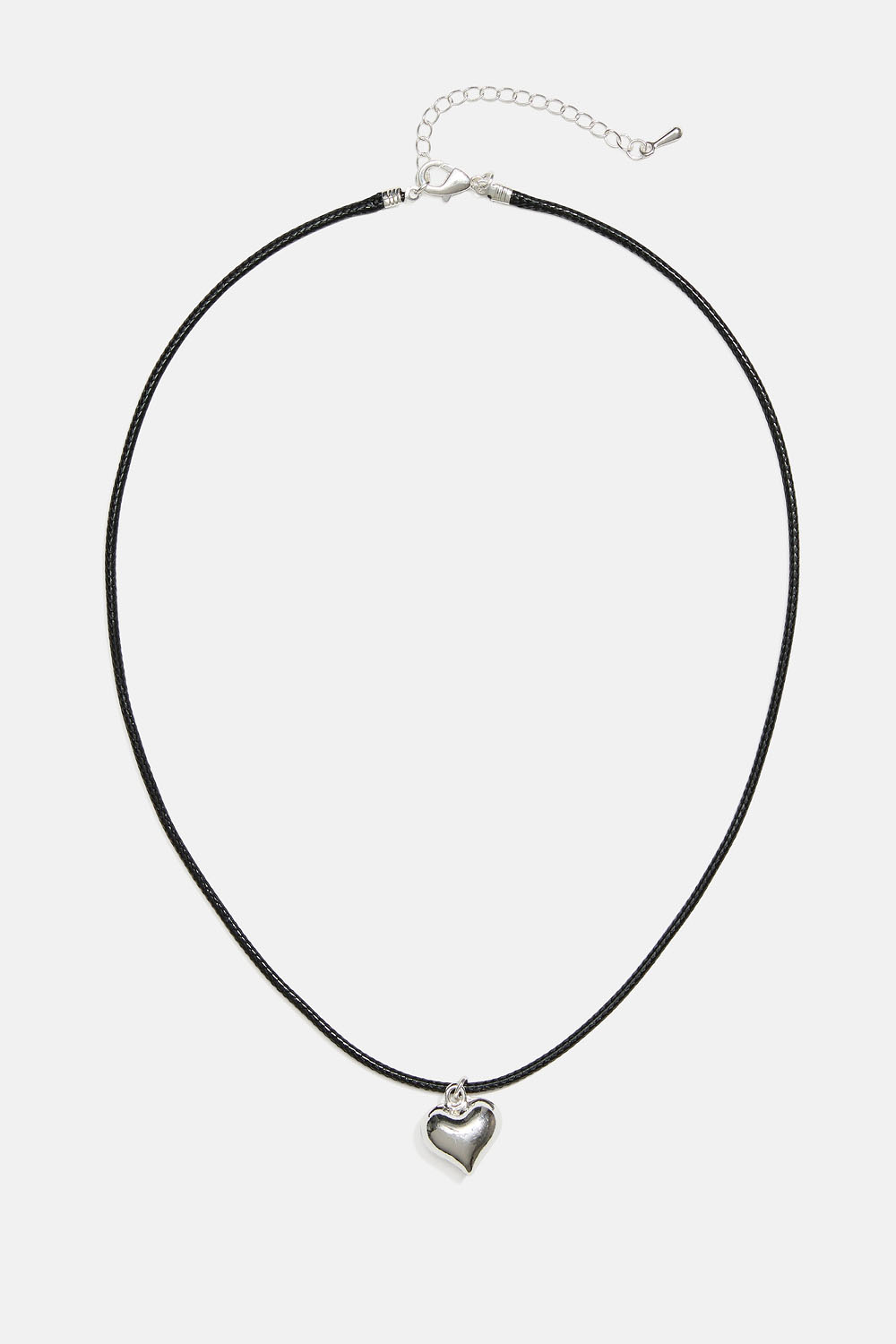 Halskjede i sort tau til barn med sølvfarget hjerteanheng.