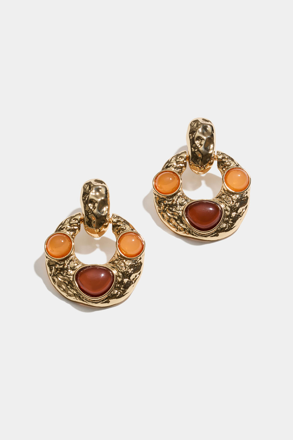 Hengende, sirkulære, hamrede øreringer med detaljer i oransje og brunt.