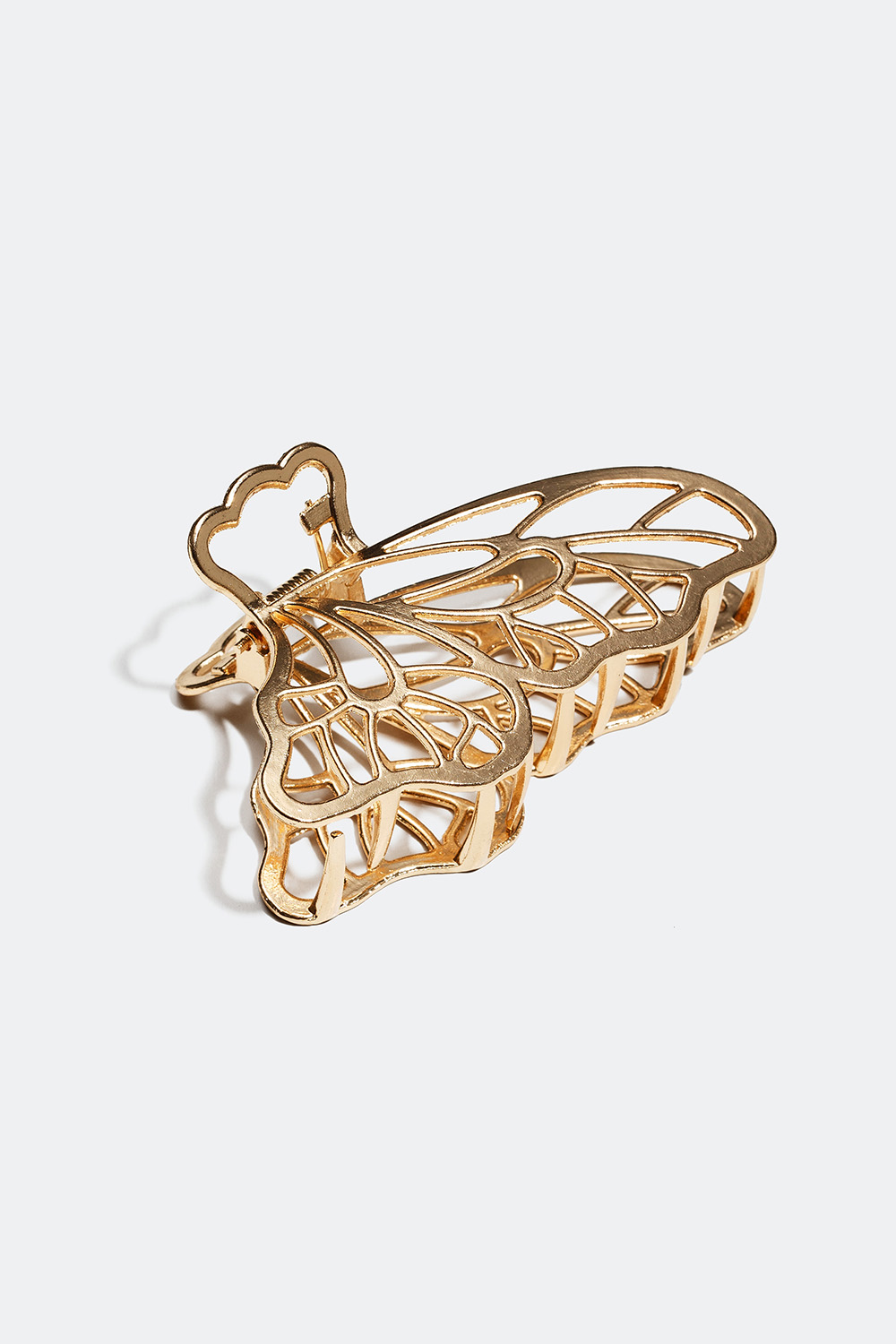 Hårklemme i gyllent metall med sommerfuglmotiv og dekorative utskjæringer. Et perfekt hårtilbehør for rask hel eller delvis oppsetting av håret, og den er enkel å ha med seg i vesken om dagen.