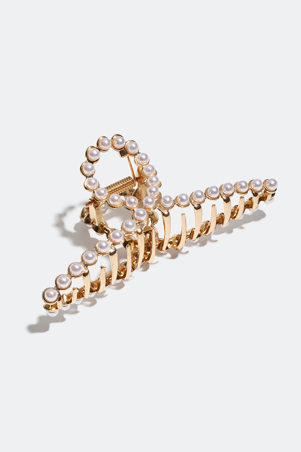 Avlang hårklype i gyllent metall med plastperler og en sløyfe som detalj, noe som gir den en fin profil. En dekorativ hårklype med tette pigger som er lengre inn mot midten og kortere ytterst. Perfekt for å sette opp håret raskt og enkelt til både hverdag og fest.