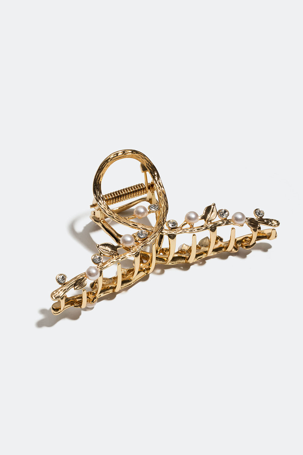 Avlang hårklype med øgle i gullfarget metall med bladmotiv, hvite perler og glassteiner. En dekorativ hårklype med tette pigger som er lengre inn mot midten og kortere ytterst.