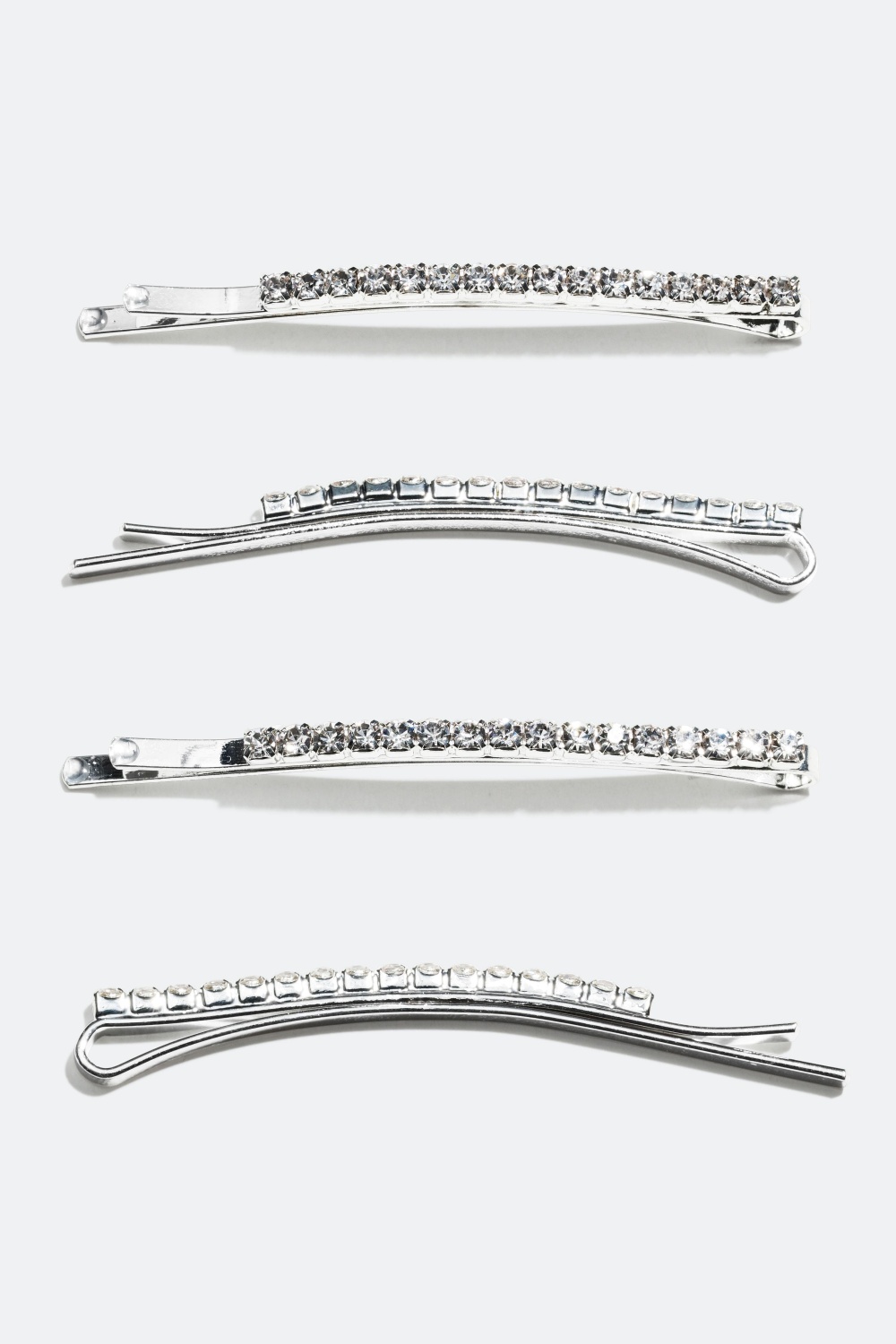 Hårnåler med glassteiner, 4-pk - Hårnåler i metall dekorerte med en rad av krystallfargede glassteiner. Forpakningen inneholder fire stk hårnåler.
