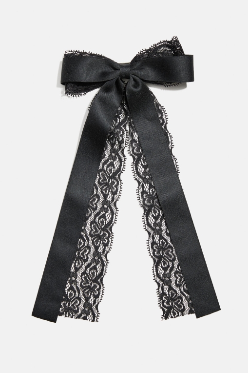 Hårspenne med dobbel sløyfe i svart bånd og svart blonder.