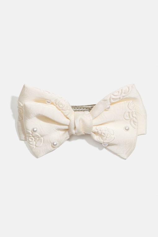 Hårspenne med hvit, dobbel sløyfe i blankt stoff med pregede roser og hvite perler.