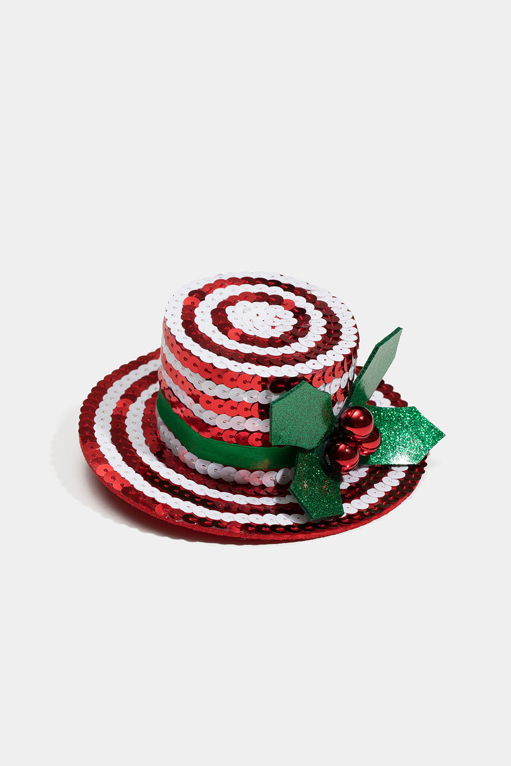 Hårspenne med liten rød- og hvitstripete, paljettkledd hatt med glitrende misteltein.