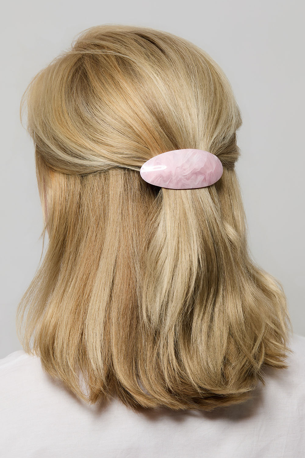 Hårspenne med rosa ovalformet detalj med marmorert mønster.