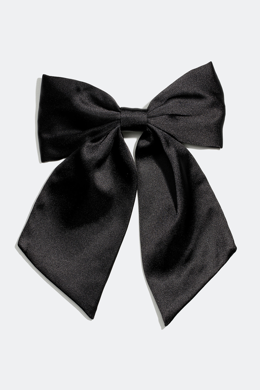 Hårspenne med stor sløyfe i svart silkeimitasjon Et dekorativt hårtilbehør i glinsende stoff skaper en fin detalj til frisyren din samtidig som det holder håret skånsomt på plass. Dette er et perfekt hårtilbehør til skoleavslutningen, ballet samt til alle sommerens fester og bryllup.