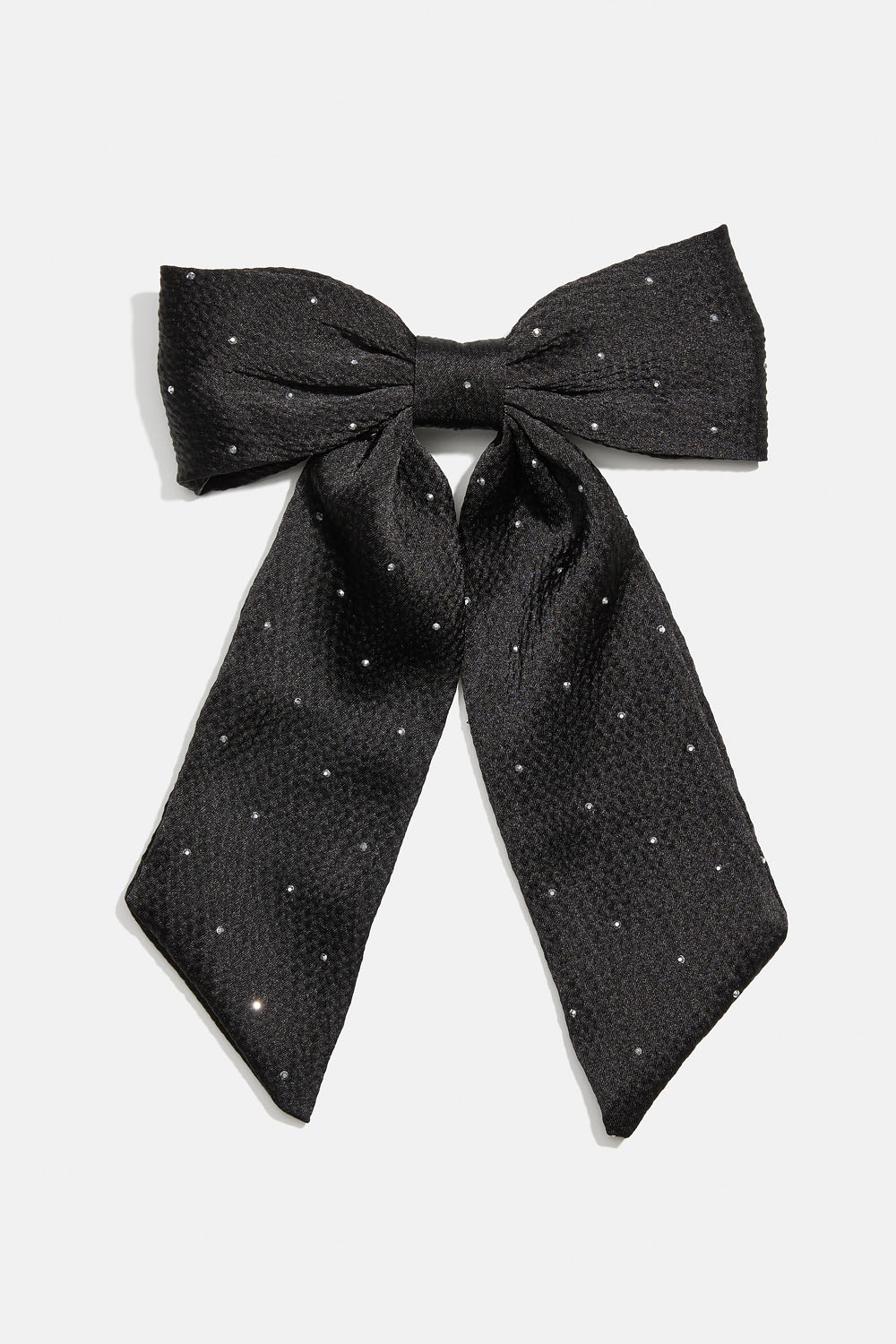 Hårspenne med sort sløyfe i blankt stoff pyntet med små sølvaktige nagler.
