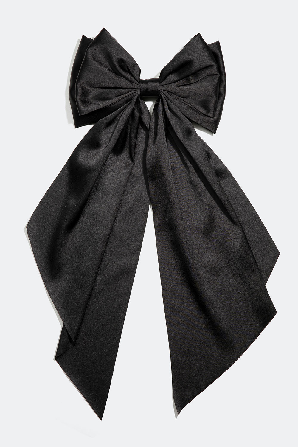 Hårspenne med stor sløyfe i svart silkeimitasjon med lange bånd. En dekorativ hårpynt i blankt stoff, som er en fin detalj til frisyren, samtidig som håret holdes skånsomt på plass. Dette er det perfekte hårtilbehøret til skoleavslutninger, ball og alle sommerens fester og bryllup.