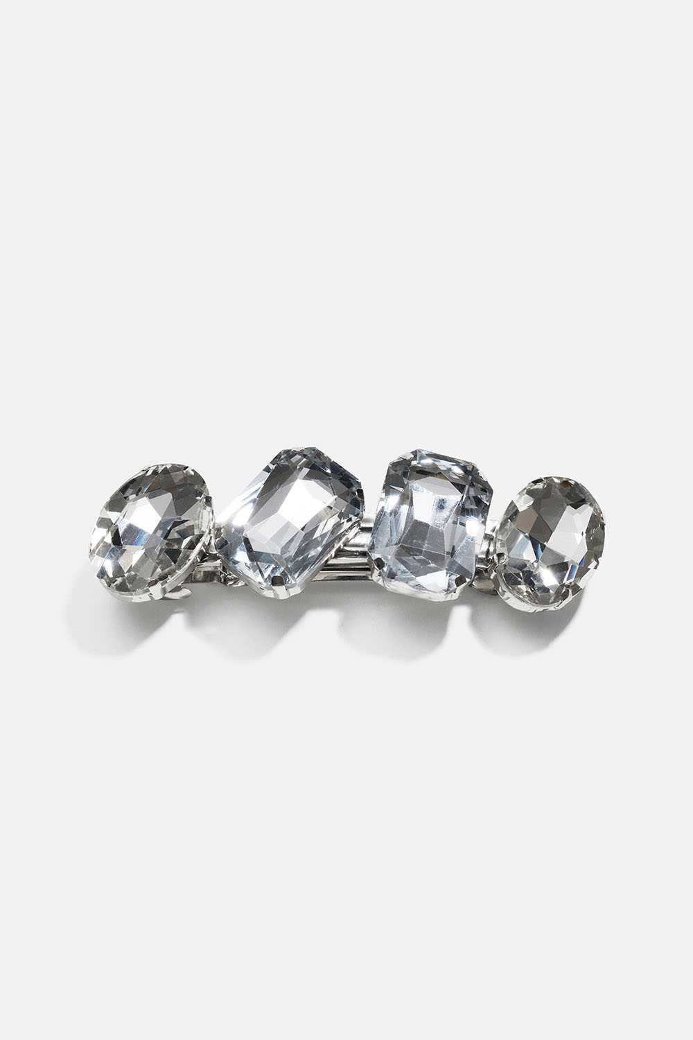 Sølvfarget hårspenne med fire hvite glassteiner i forskjellige former.