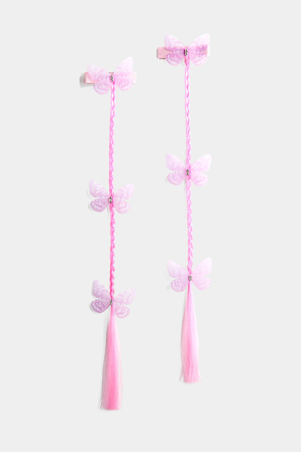 To hårspenner med hengende fletter i rosa. Flettene har dekorative sommerfugler i lilla med plastdiamanter i midten.