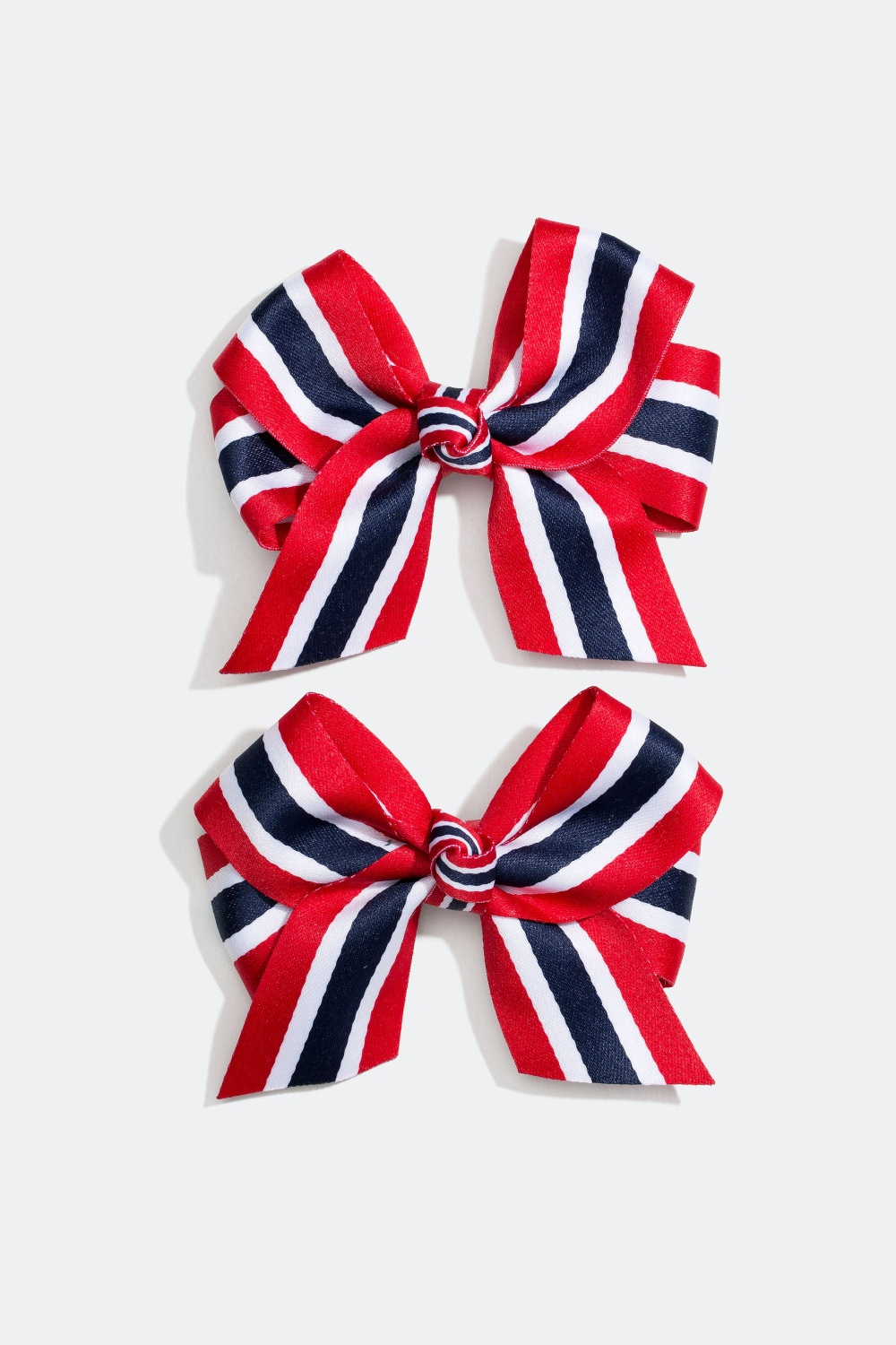 2-pakning hårspenner med sløyfer i de norske fargene rødt, hvitt og blått. Det perfekte tilbehøret til 17. mai-feiringen!