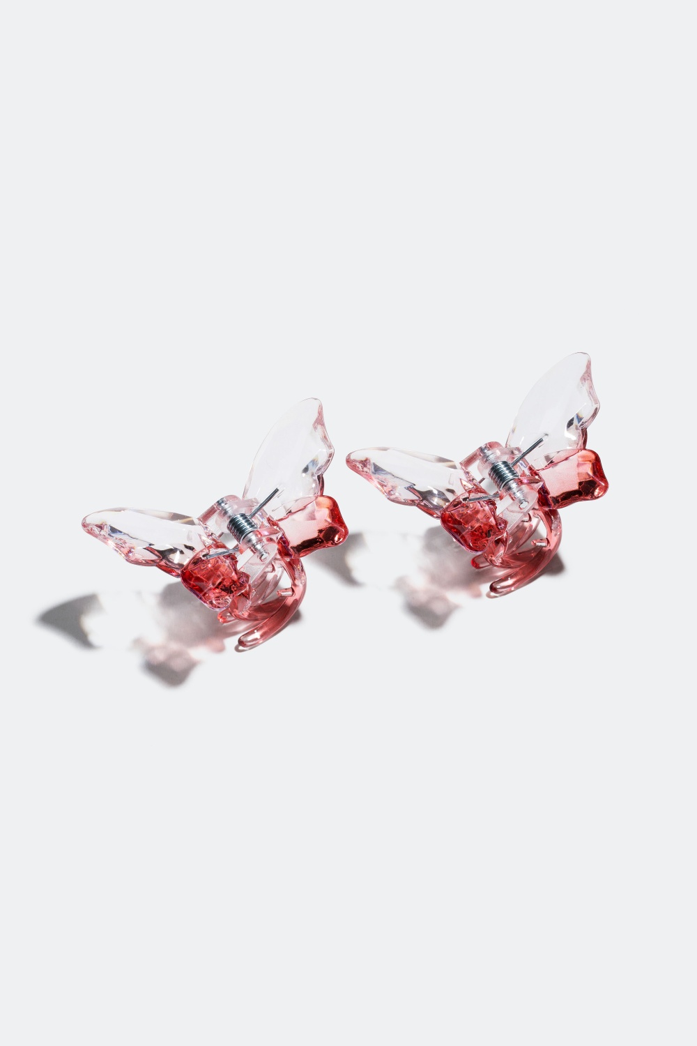 To hårspenner formet som sommerfugler, i gjennomsiktig plast i rosa nyanser.