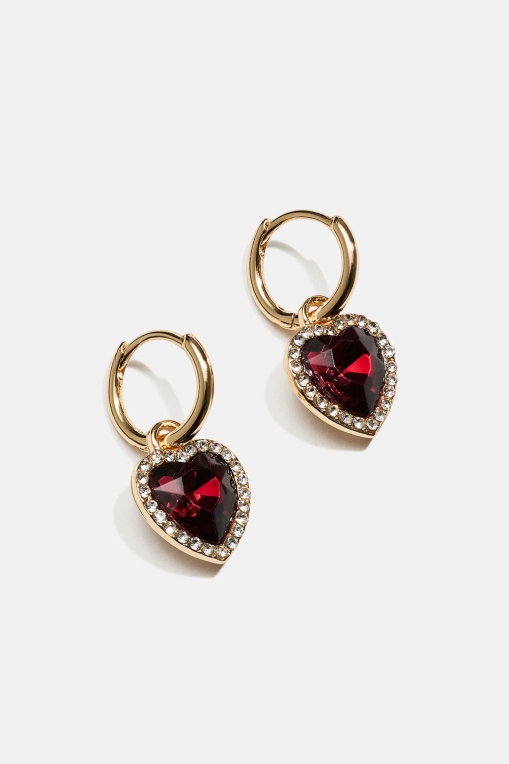 Gullfargede, hjerteformede øreringer i metall med hengende burgunderrøde hjerteformede glassteiner med strass.