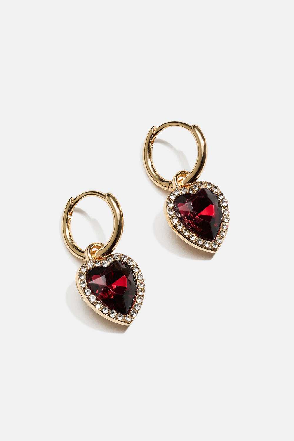 Hjerteformede burgunderrøde øreringer med hjerteformede glassteiner