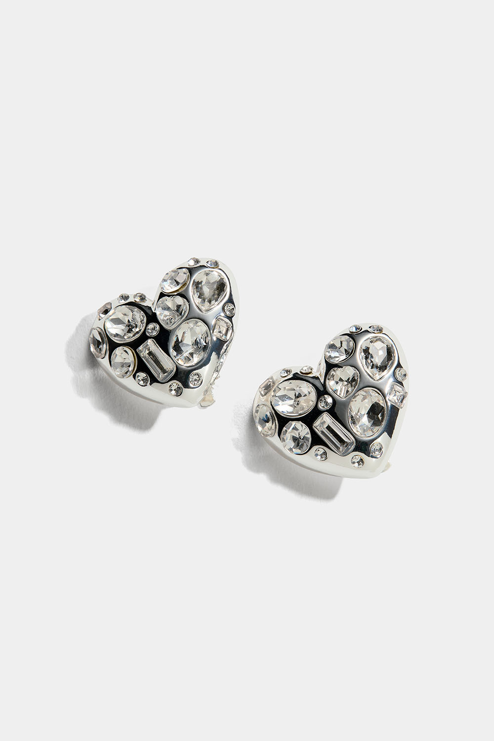 Hjerteformede klipsøredobber i sølvfarget metall dekorert med hvite glassteiner i ulike former.