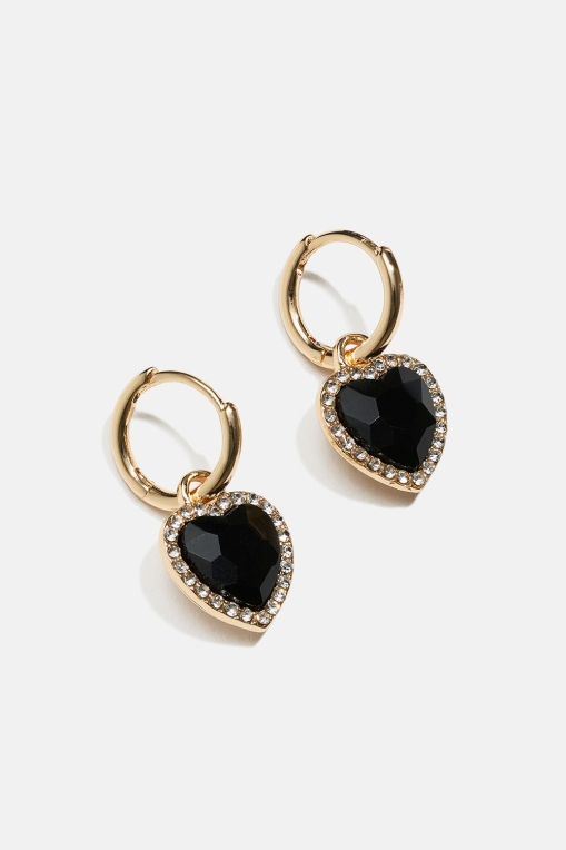 Gullfargede, hjerteformede øreringer i metall med hengende svarte hjerteformede glassteiner med strass.