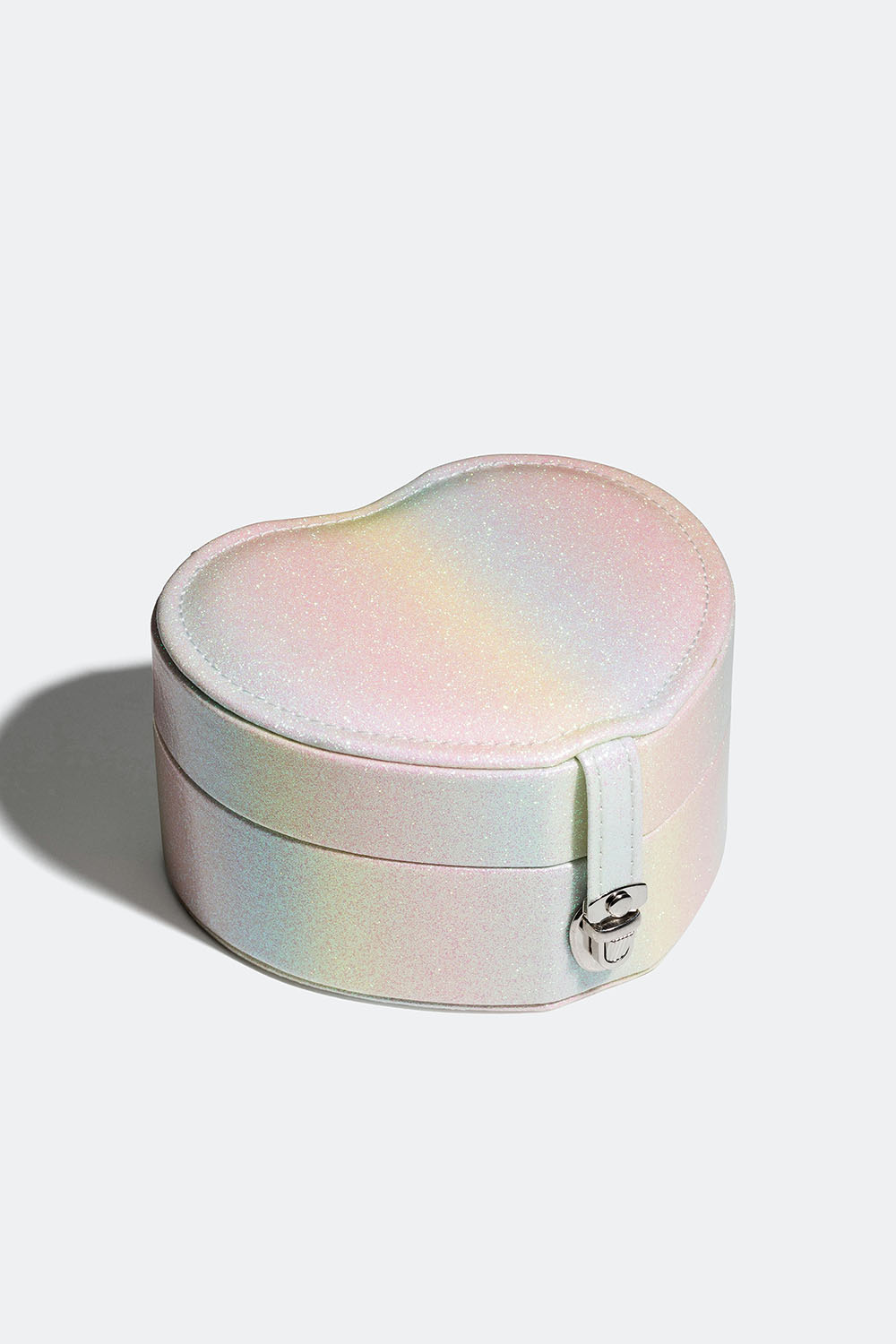 Glittrende, hjerteformet smykkeskrin i lyse regnbuefarger. Skrinet åpnes og lukkes ved hjelp av en spenne. Innvendig er det et rom til ringer og øredobber, og ett til halskjeder og armbånd.