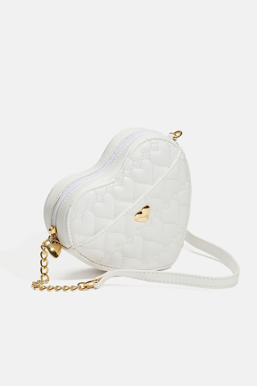 Hvit, vattert, hjerteformet veske til barn. Vesken har en gullfarget, kjedet skulderrem og lukkes med glidelås. Vesken har et stort rom og et mindre på foran.