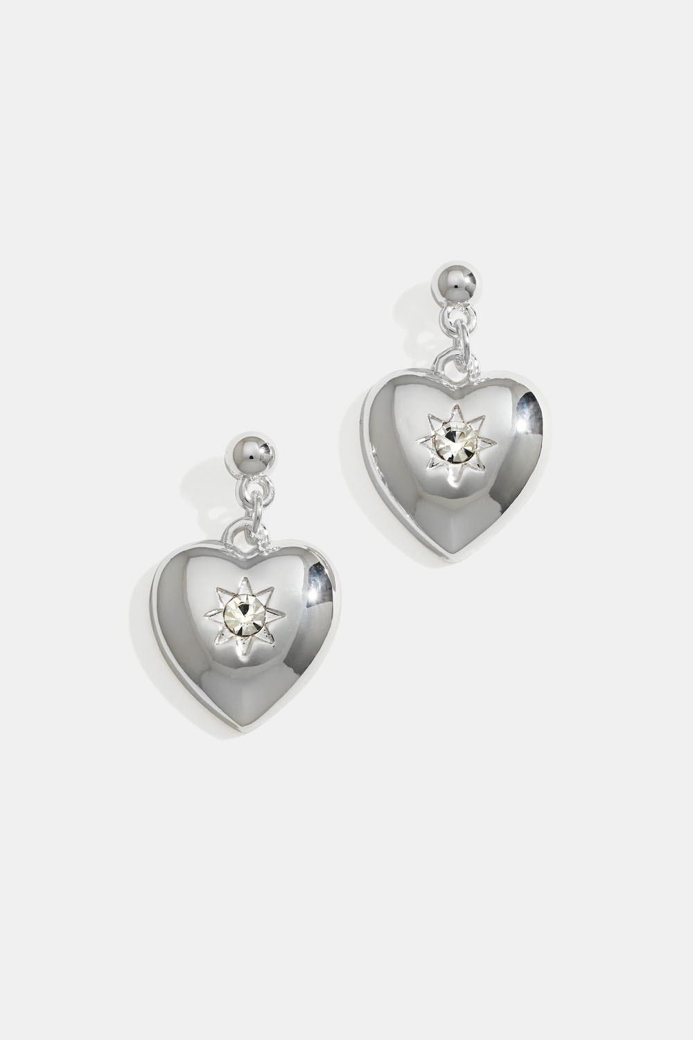Øredobber med hengende hjerter, dekorert med en stjerne og en liten, hvit sten