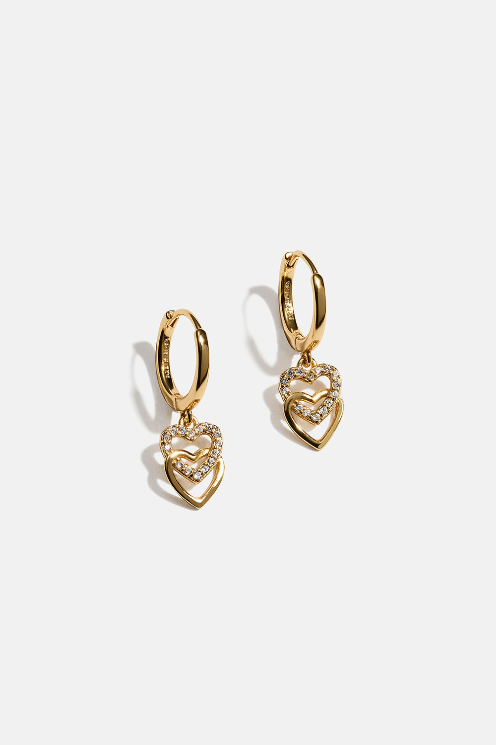 Hoops i 18k gullbelagt ekte sølv med hengende doble hjerter dekorert med kubisk zirkonia-steiner.