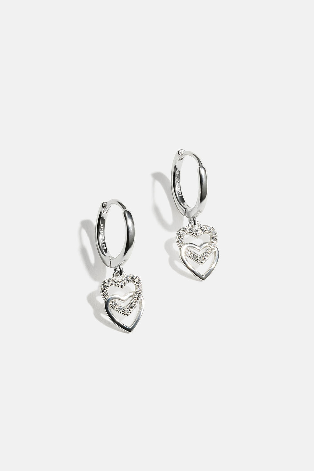 Hoops i ekte sølv med hengende doble hjerter dekorert med kubisk zirkonia-steiner.