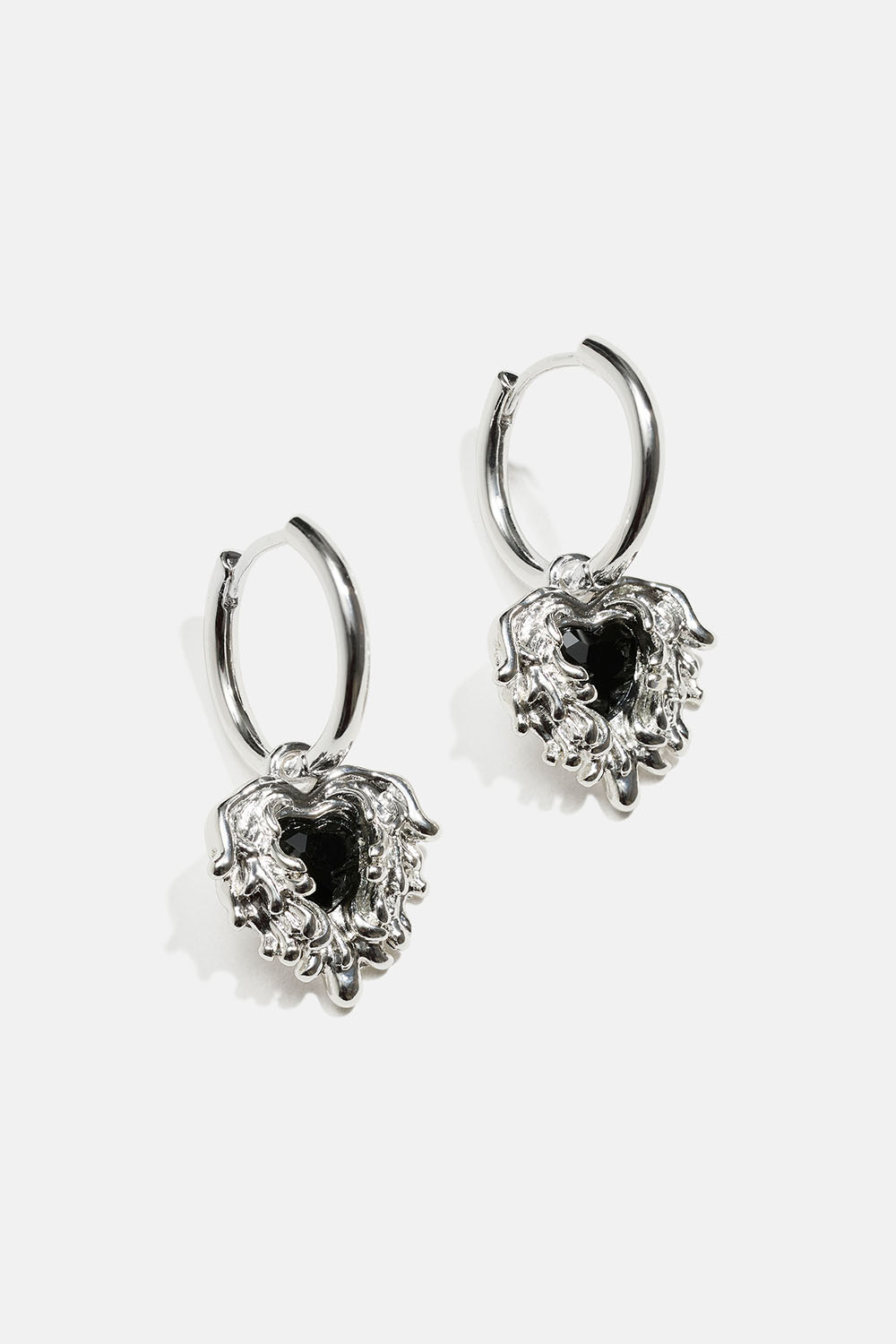 Øreringer med hengende hjerter i smeltet design og svart glasstein.