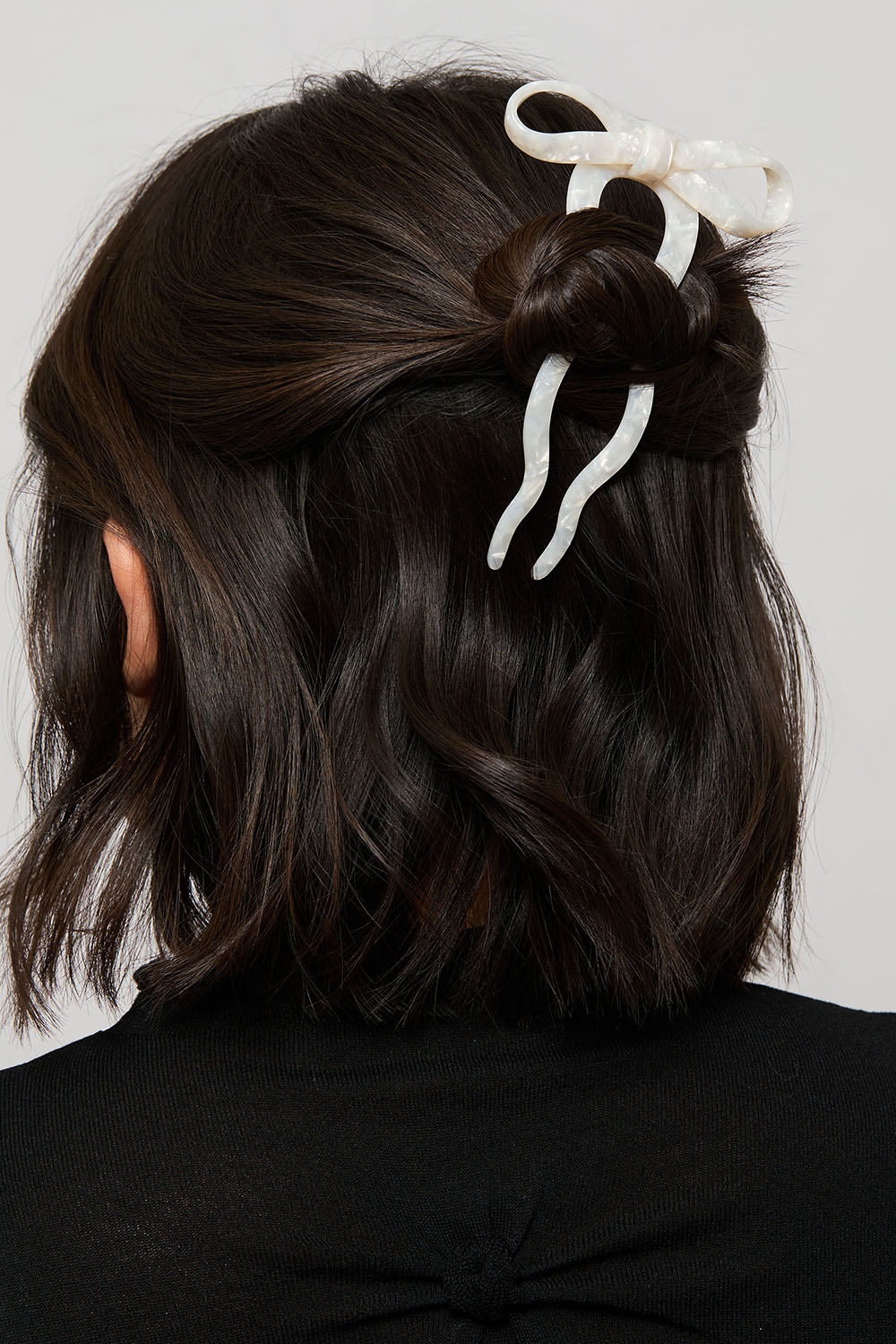 Hvitmelert fransk hårnål med dekorativ rosett.