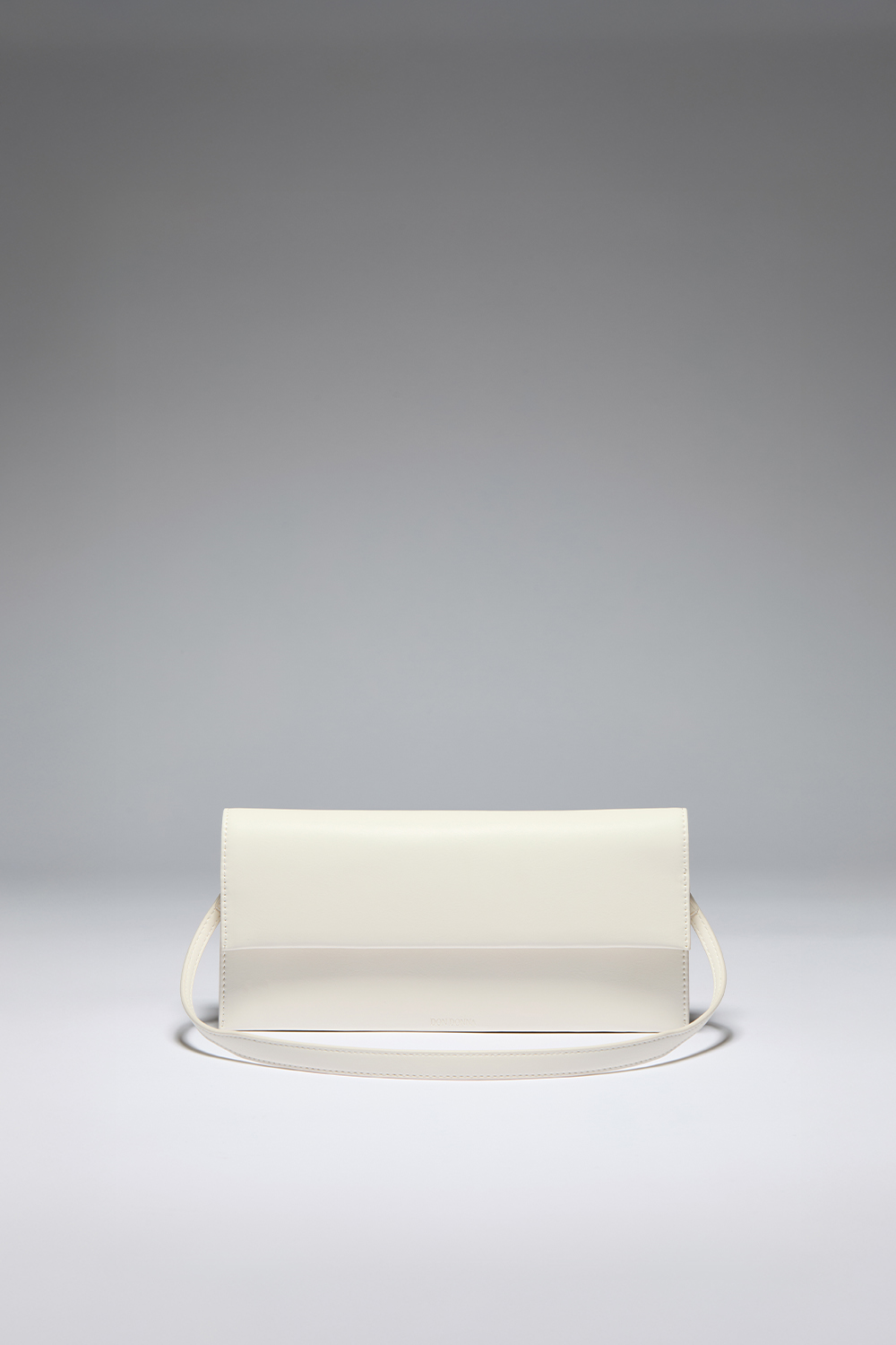 Hvit konvoluttveske i imitert skinn med en inngravert, liten Don Donna-logo. Vesken lukkes med magnet og har tre rom på innsiden, ett som lukkes med glidelås. Det følger med en avtagbar skulderrem.