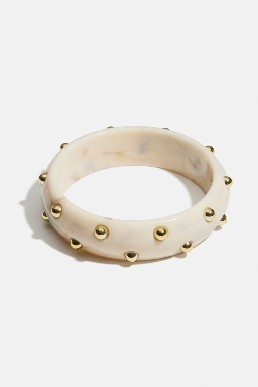 Bredt armbånd i kremhvit akryl med marmorering og runde gullfargede nagler.