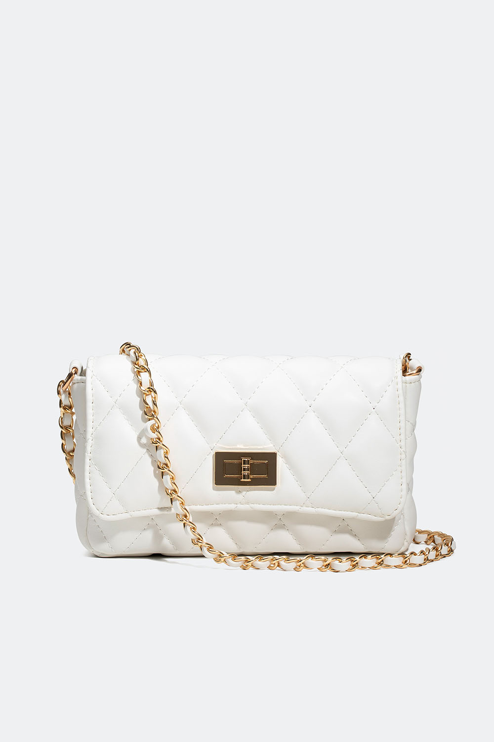 Liten, rektangulær skulderveske i hvitt, quiltet kunstskinn som også kan bæres som crossbody. En stilren veske med gullfarget skulderrem, pyntet med hvitt kunstskinn. Lukkes med en magnetspenne, og på innsiden er det også et mindre rom.