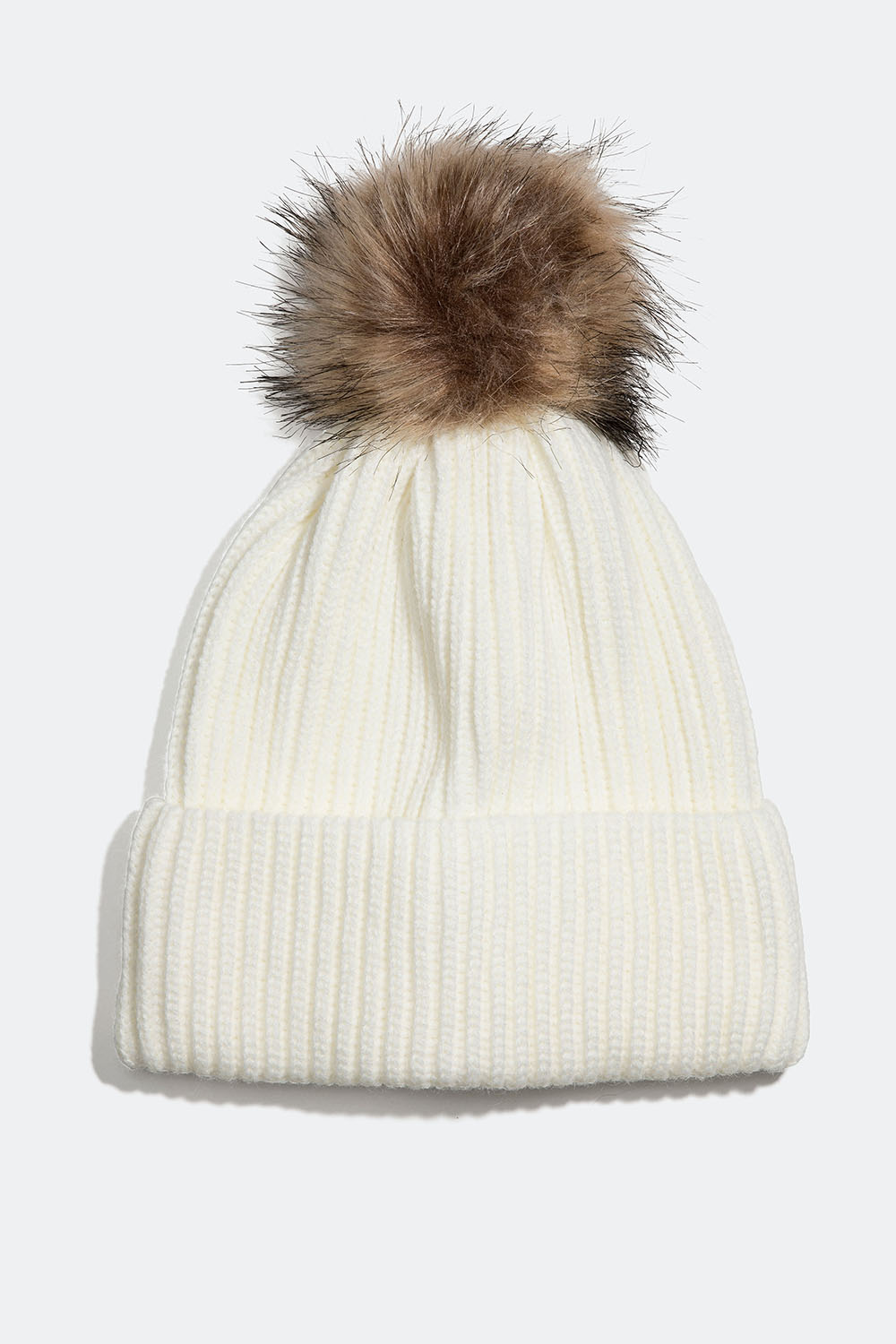 Hvit ribbestrikket lue med oppbrett og fluffy dusk. Varme accessoirer i klassisk design som passer i flere sesonger, og er perfekt på kalde dager.