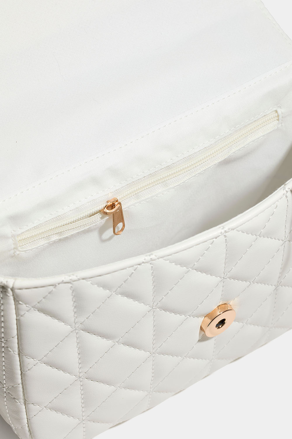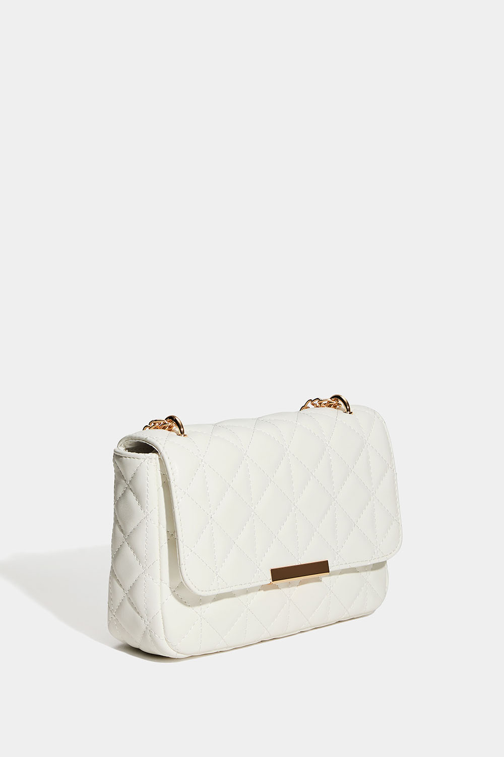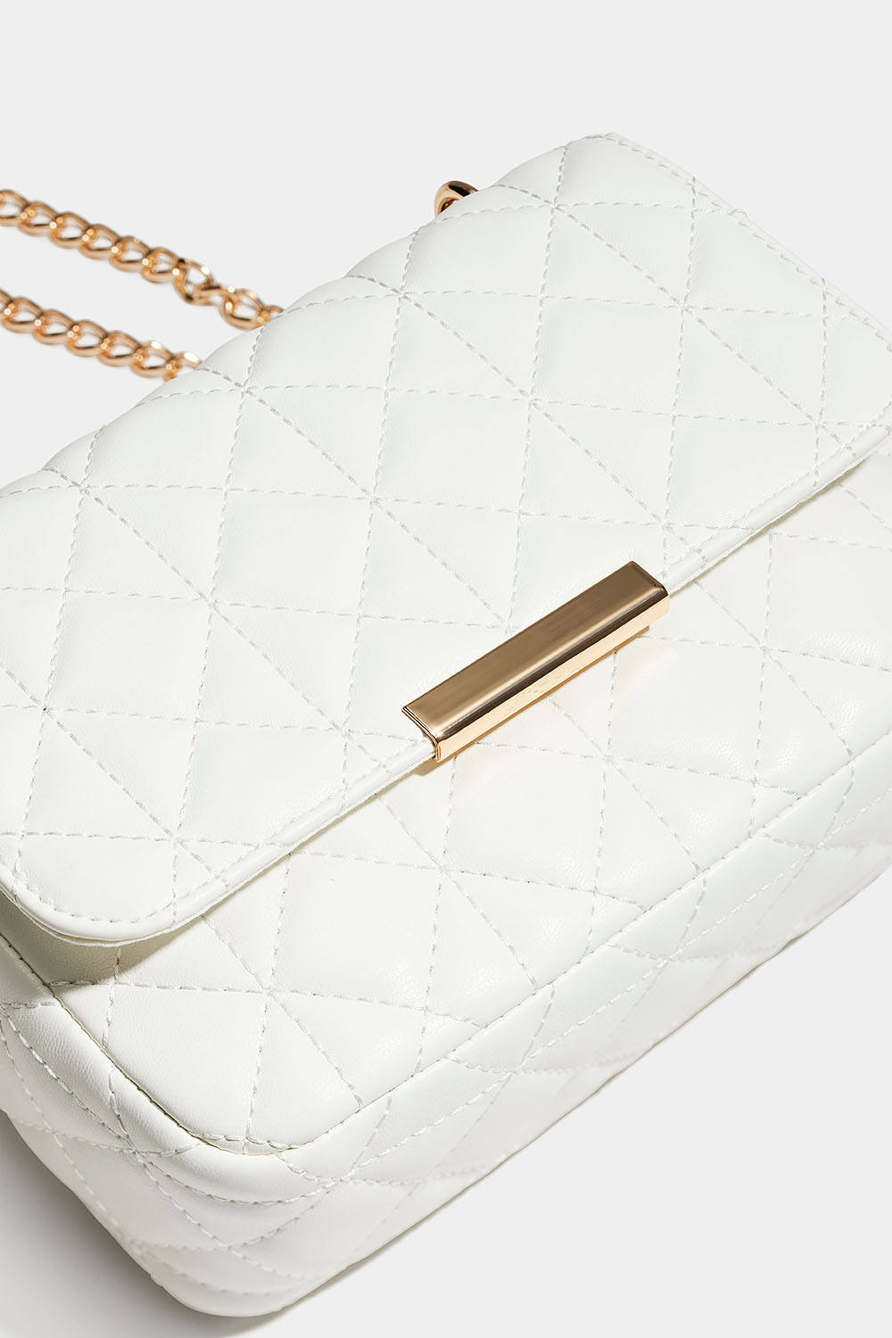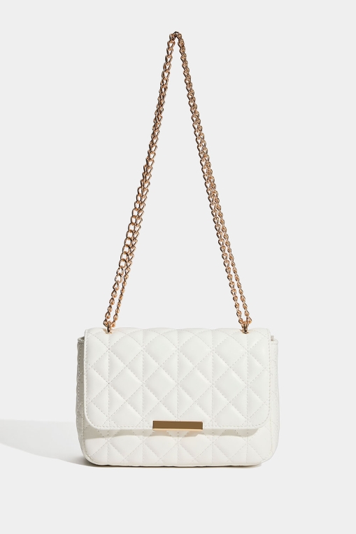 Hvit veske med quiltet design og gullfarget skulderrem med kjede. Du kan enten brette kjeden for en kortere skulderstropp, eller som en lengre – og da kan vesken også bæres på tvers. Vesken lukkes med en magnetknapp og har et lite innerrom som lukkes med glidelås.