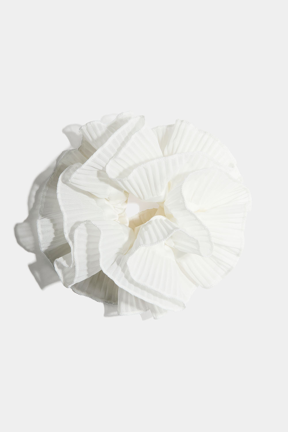 Stor, hvit scrunchie med hvit imitert silke og plissert tyll med sydde kanter.