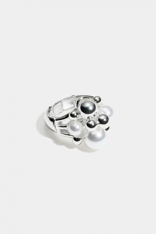 Justerbar ring i sølvfarget metall med hvite og sølvfargede perler.