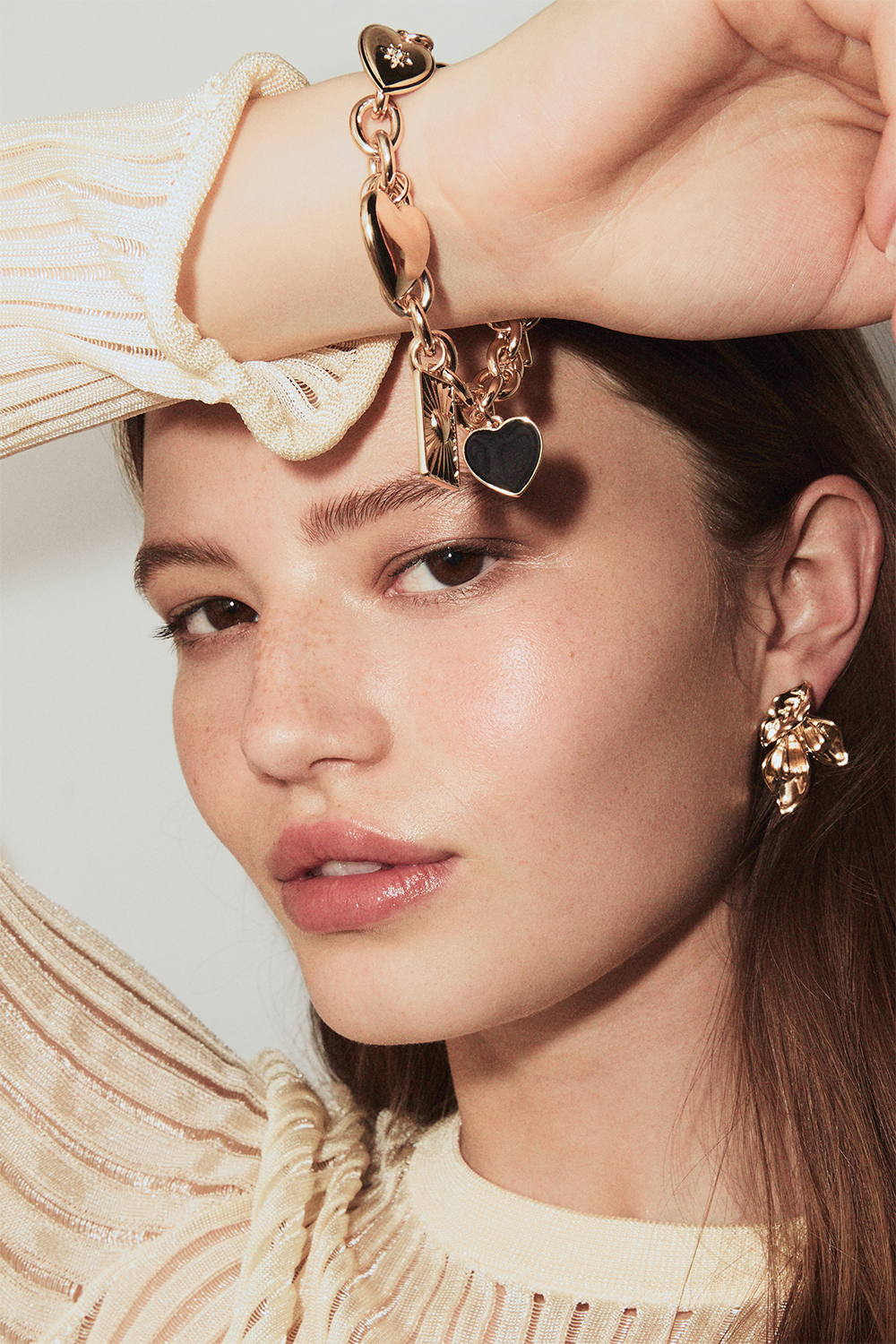 Gullfarget kjedearmbånd med fem hengende anheng formet som hjerter. Armbåndet lukkes med en T-lås.