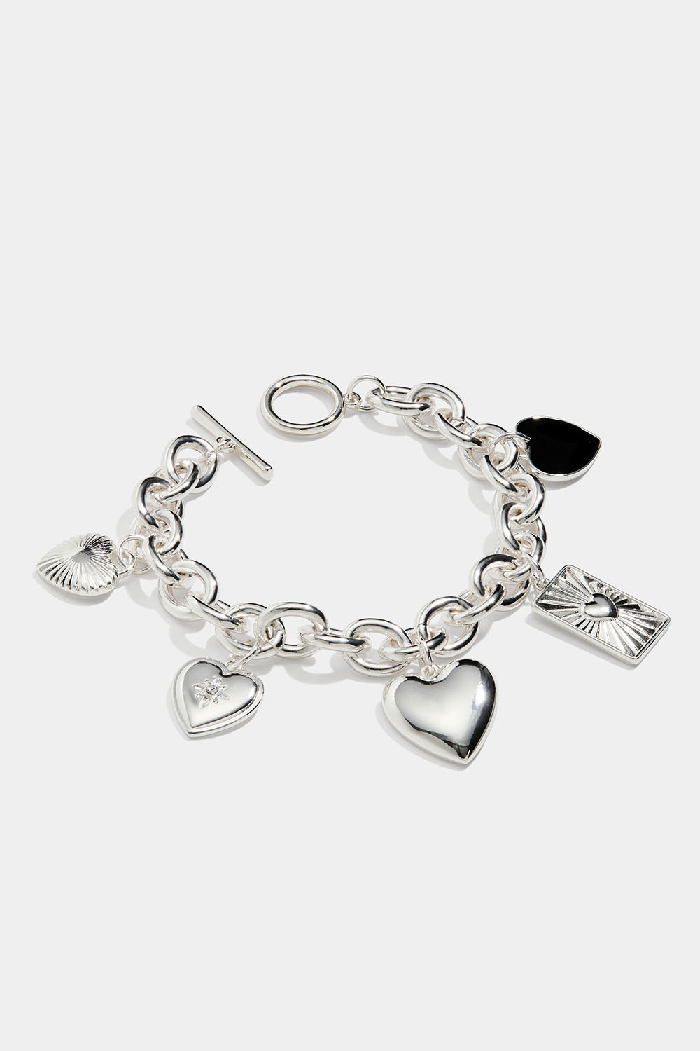 Sølvfarget kjedearmbånd med fem hengende anheng formet som hjerter. Armbåndet lukkes med en T-lås.