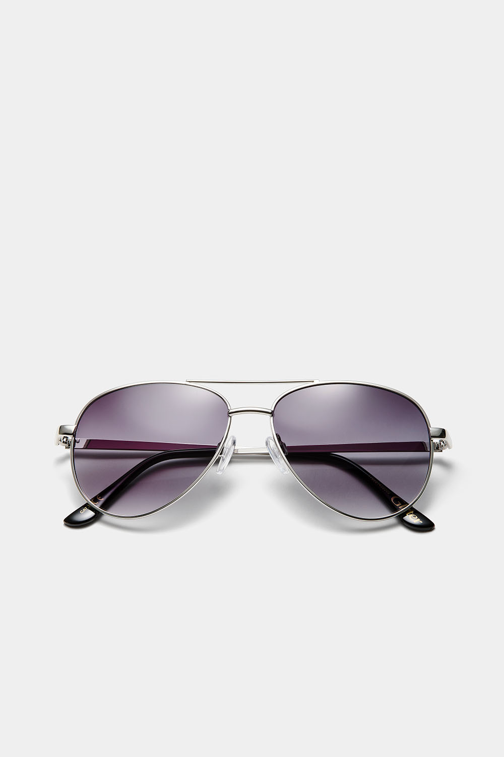 Pilotsolbriller med dobbel bro, gråtonede glass og metallinnfatning.