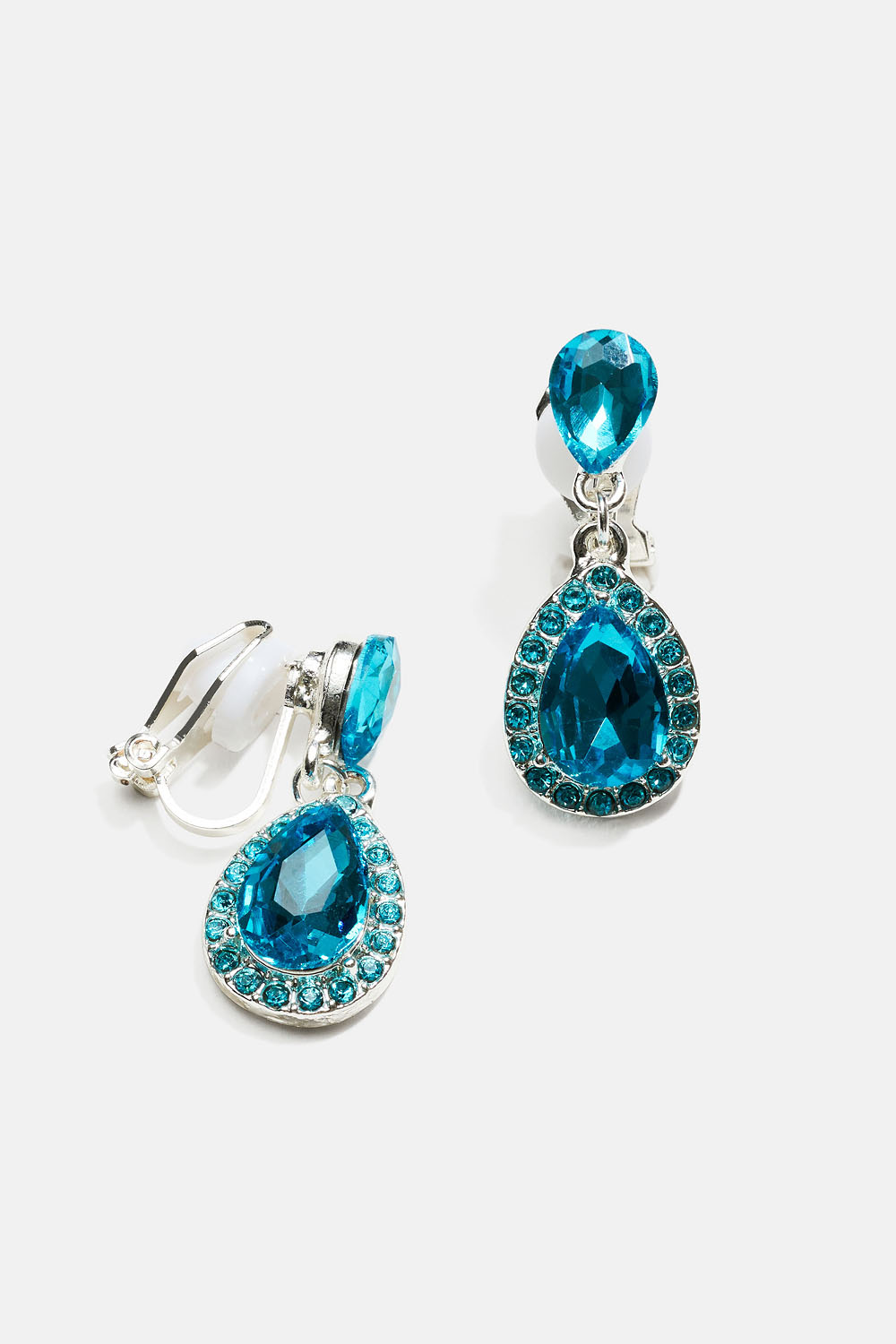Klipsøredobber med blå, dråpeformede stener og små stener rundt.