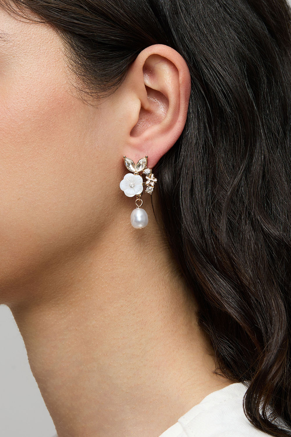 Klipsøreringer i gullfarget metall med hvite blomster, glassteiner og anheng med hvite perler. Et par dekorative øredobber som er perfekte for dem som ikke har hull i ørene.