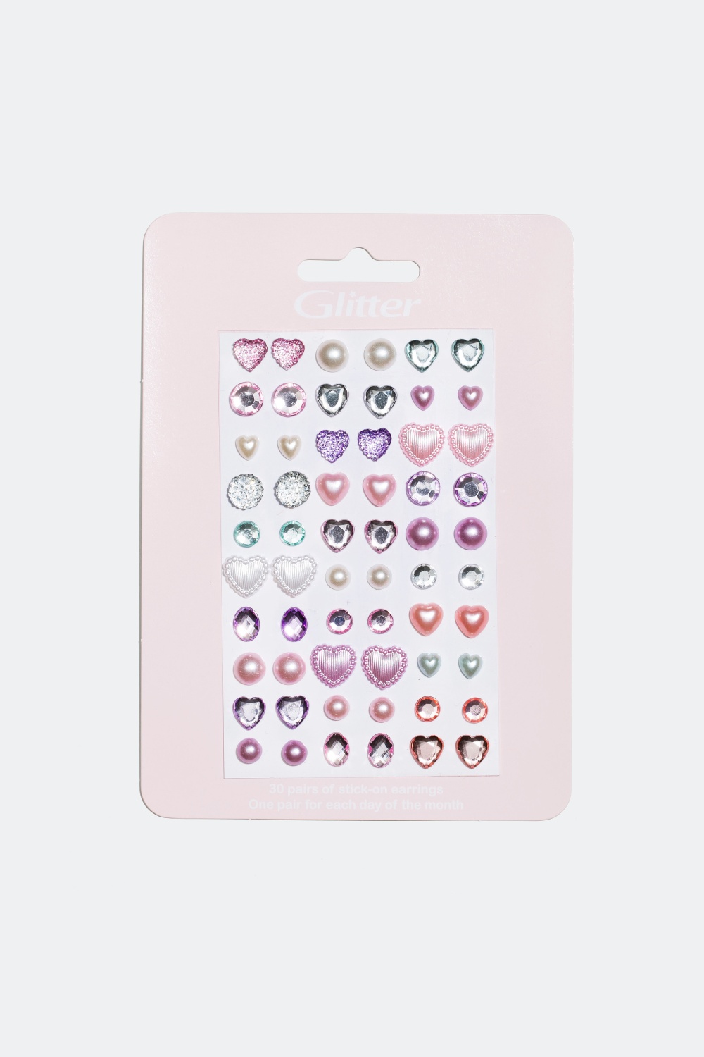 30 klistremerkeøredobber formet som hjerter og perler i forskjellige størrelser og strukturer, i nyanser av rosa, lilla, hvitt og blått.