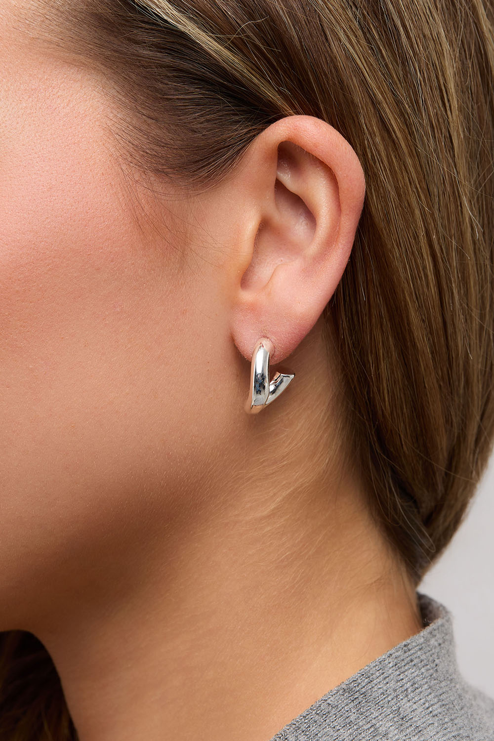 Øredobber i sølvfarget metall i kraftig stil og lett bøyd form.