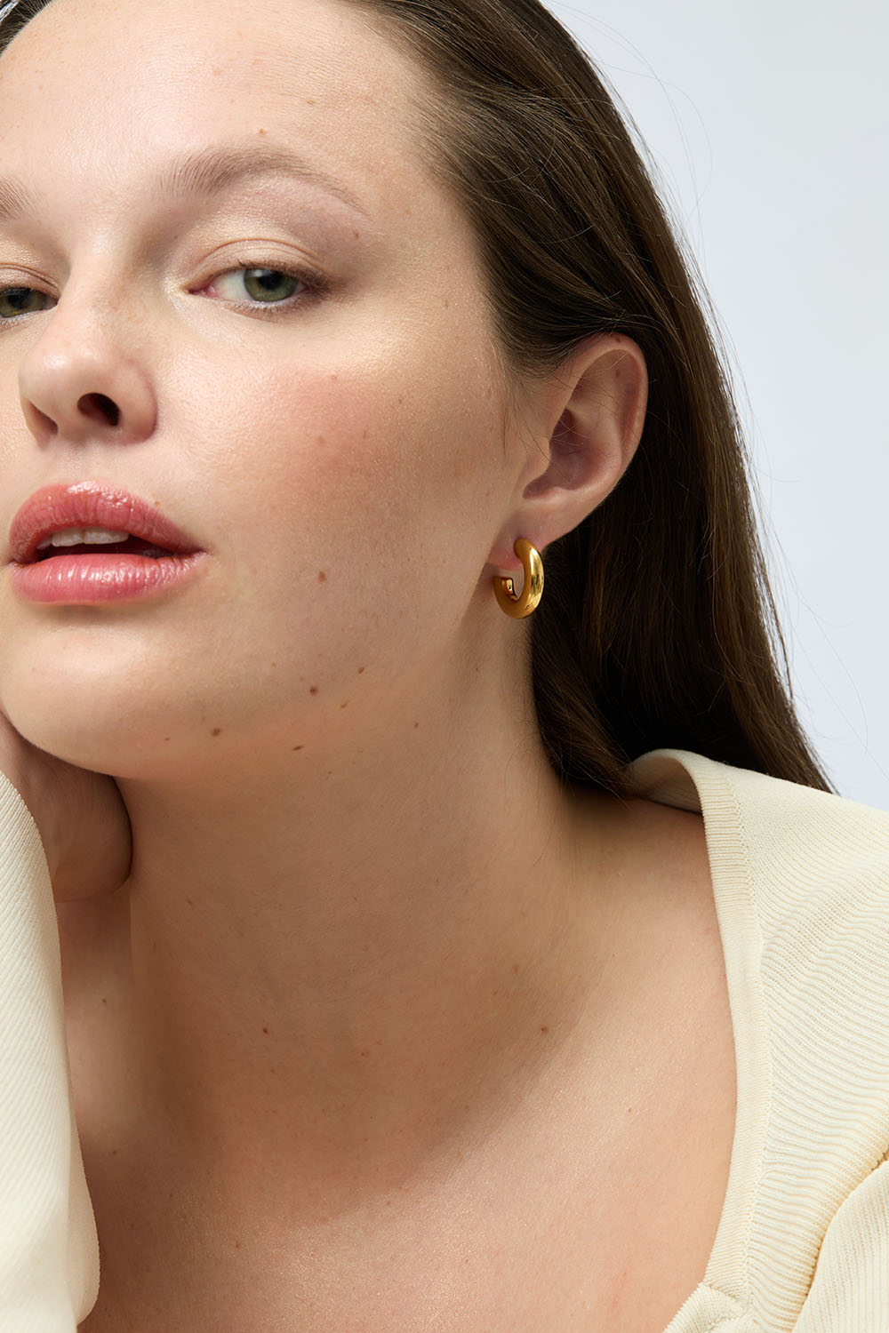 Øredobber i høypolert rustfritt stål som er PVD-belagt med 18 k gull. Dette er et smykke som tåler vann og er laget av et allergivennlig og slitesterkt materiale slik at de holder seg fine lenge. Du kan bade, dusje og trene uten å bekymre deg for at fargen forsvinner. Les mer her.