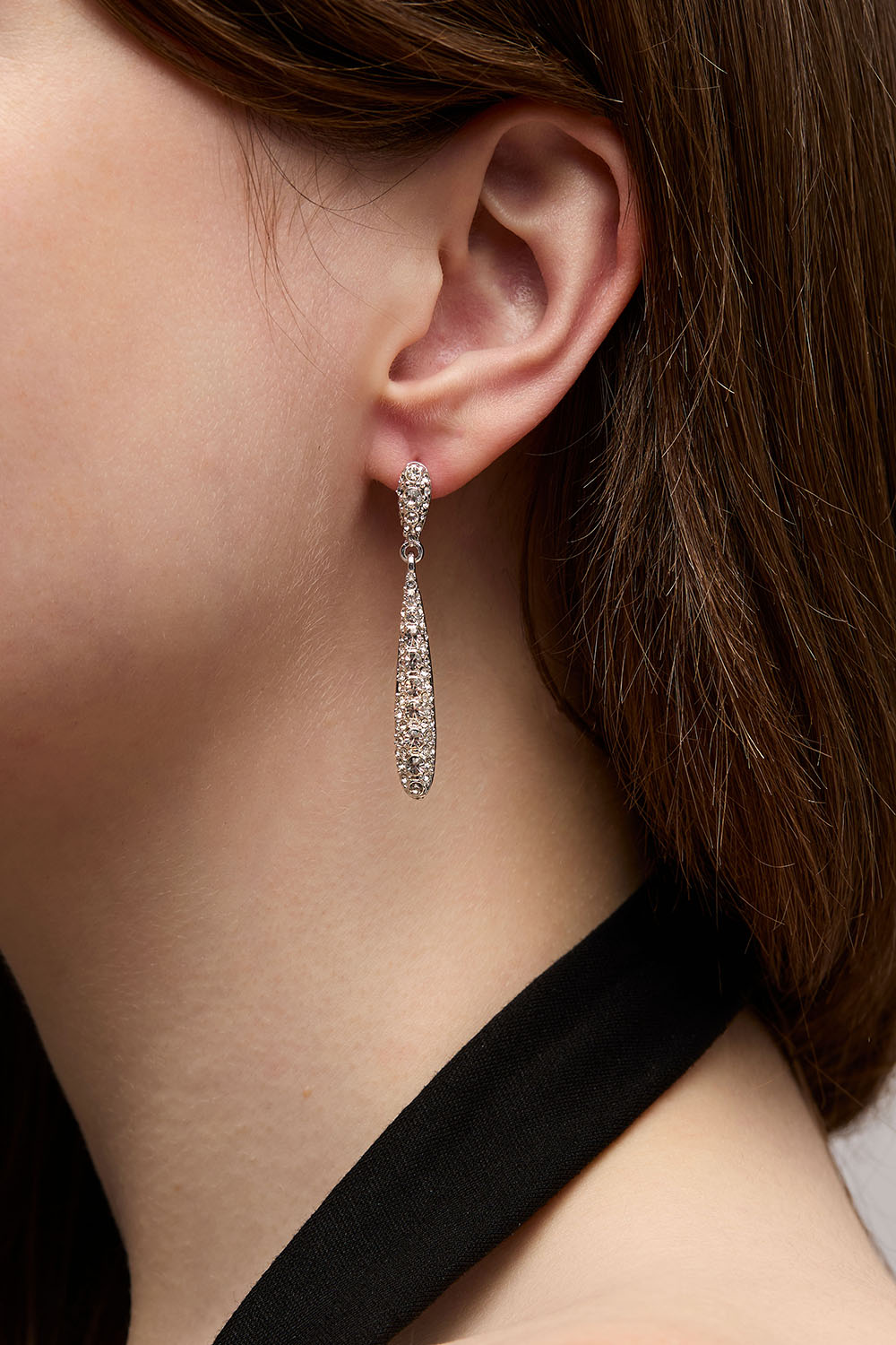 Dråpeøreringer med avlang form i grått pistolmetall dekorert med hvite glassteiner i forskjellige størrelser.