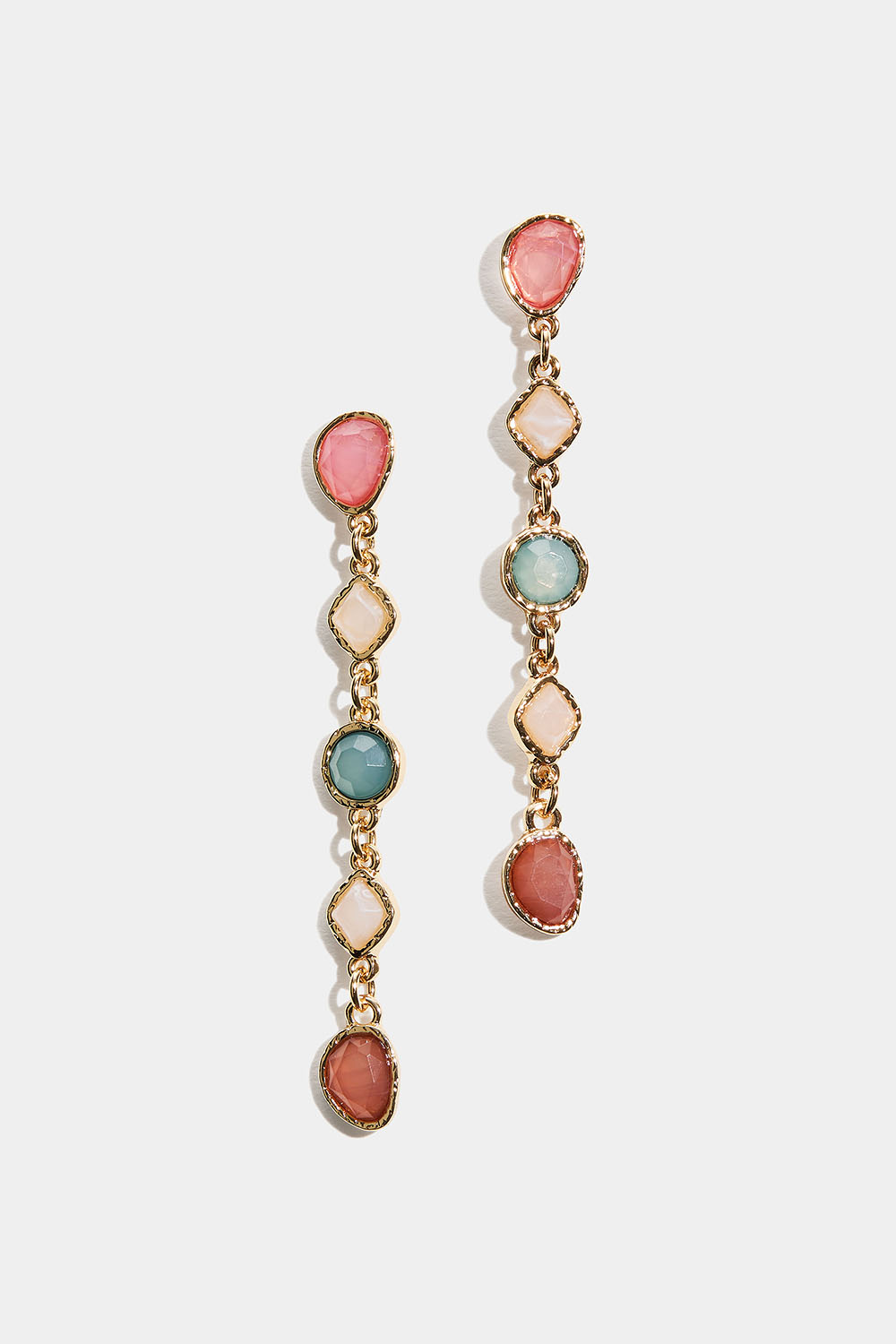 Lange øredobber med anheng laget av plaststeiner med organiske former og forskjellige farger.