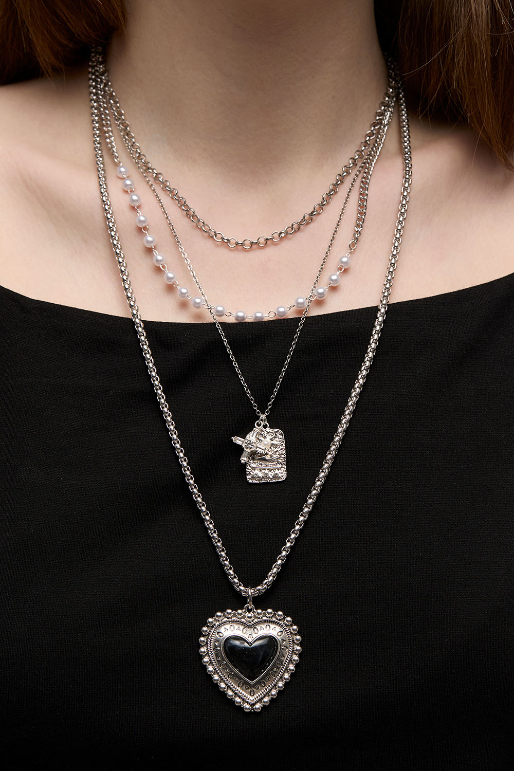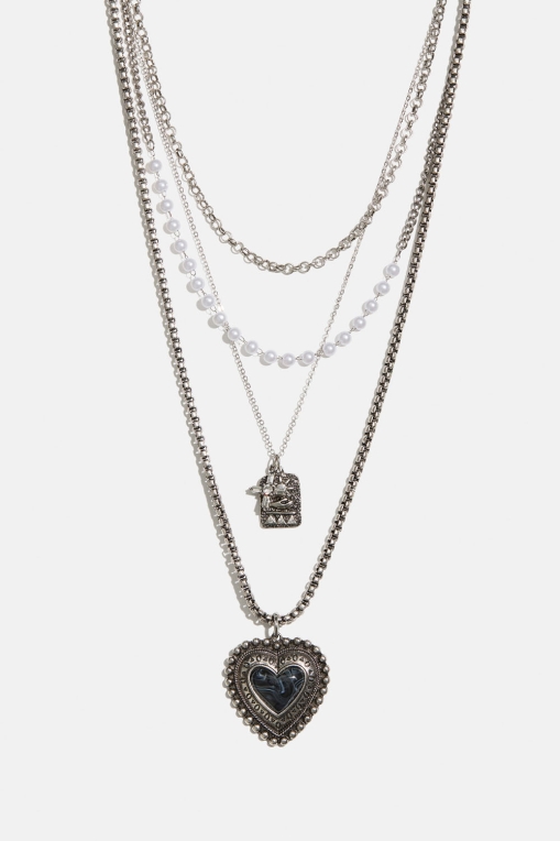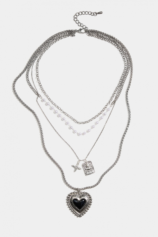 Langt halskjede i mørk sølvfarget metall med fire forskjellige kjeder i forskjellige lengder og design. Halskjedet er blant annet dekorert med hvite perler og hjerteanheng.