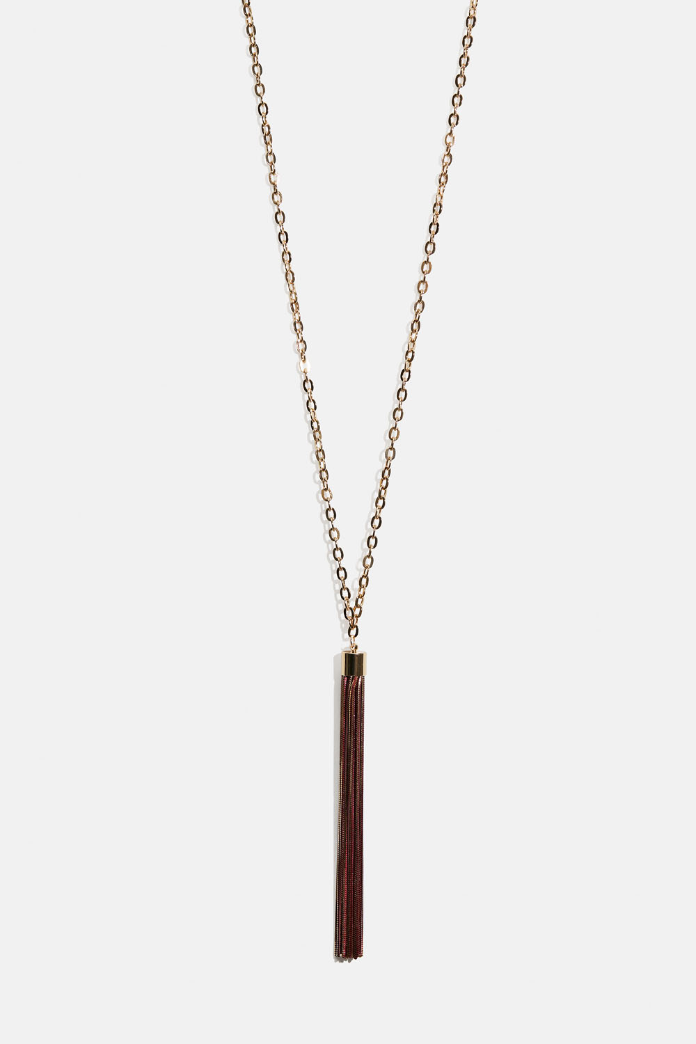 Langt halskjede i gullfarget metall med metallanheng i rødt duskdesign.