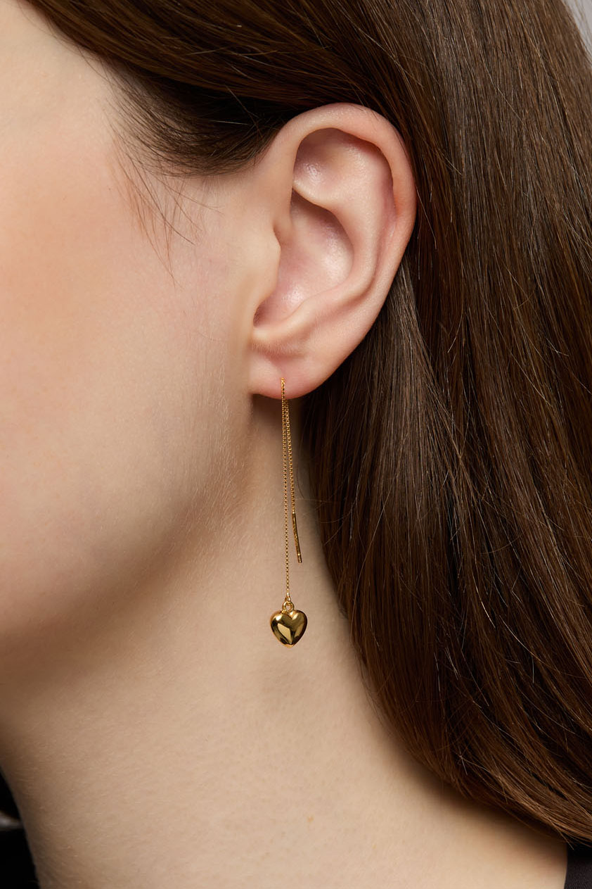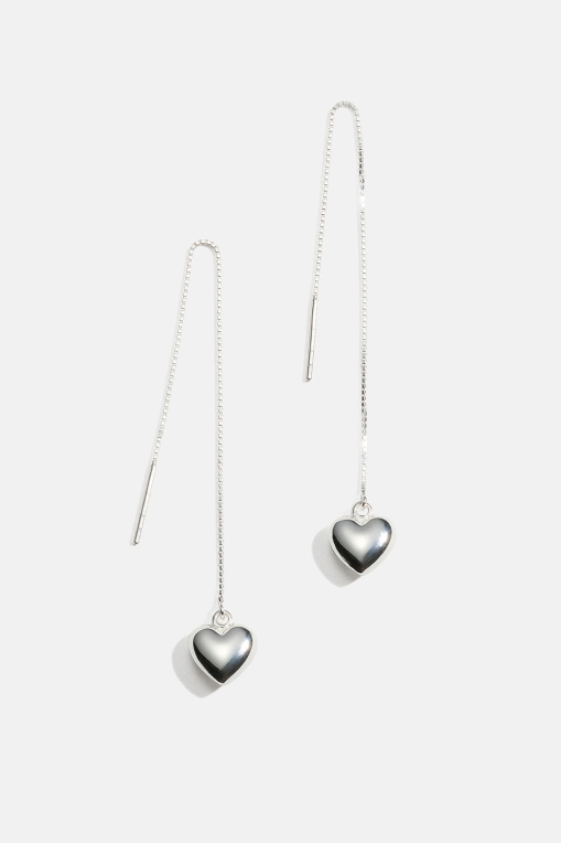 Øredobber i ekte sølv med en tynn lenke som tres gjennom øret, med et hjerte.